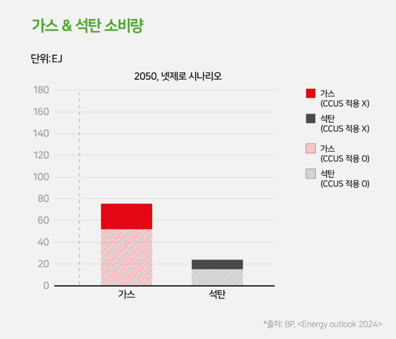 ‘넷제로(Net Zero) 시나리오’에 의하면 천연가스 수요는 “2020년대 중반 정점 이후 2050년까지 2022년 기준 약 50% 감소”할 것으로 나타납니다. 이는 기술의 발전에 따라 “에너지 효율 개선과 전기화로 인해 천연가스 수요가 줄어들기 때문”입니다. 또한, “천연가스로 인해 발생하는 이산화탄소의 약 80%는 CCUS 기술을 통해 저감”될 것으로 예상되었습니다.