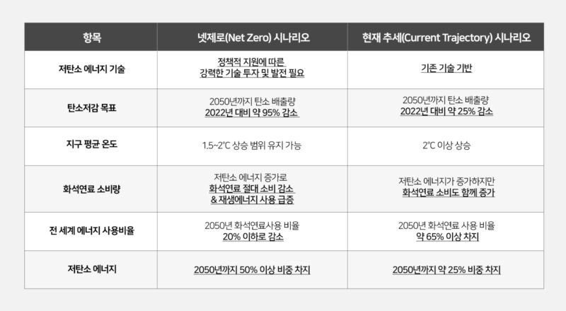2023년부터 이 보고서의 기조가 변화합니다. 이는 러-우 전쟁으로 인한 인플레이션과 미국의 인플레이션 감축법(Inflation Reduction Act, IRA)*이 에너지 시장에 미친 영향 때문입니다. 실제로 지난 7월 10일 발간된 2024년 보고서에서는 변화된 현실을 반영하기 위해 ‘넷제로(Net Zero) 시나리오’에 더해 ‘현재 추세(Current Trajectory)**시나리오’를 함께 제시하였습니다.