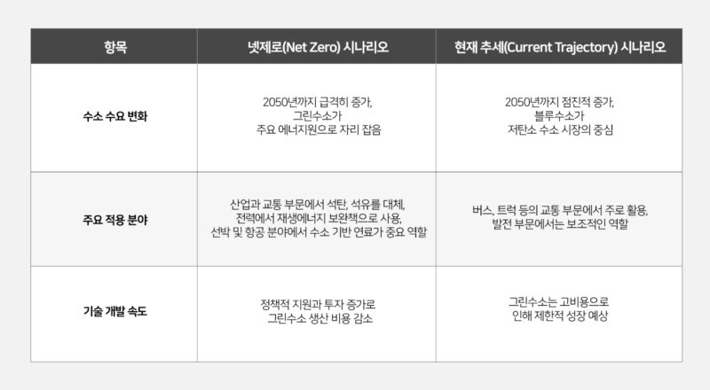 ‘넷제로(Net Zero) 시나리오’에 따르면 “2050년까지 수소 수요 및 생산은 급격히 증가”하며, “그린수소가 주요 에너지원으로 자리 잡을 것”으로 보입니다. 또한 “블루수소 생산을 위한 CCUS 기술이 전방위적으로 적용되어 수소는 산업, 교통, 전력 부문에서 널리 활용될 전망”입니다.