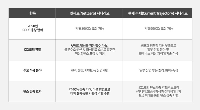 ‘현재 추세(Current Trajectory) 시나리오’에서는 “2050년, 화석 연료에서 발생되는 약 9억 톤의 이산화탄소를 포집”할 수 있으며, CCUS는 철강, 화학 산업 및 블루수소 생산에 도입될 예정입니다.