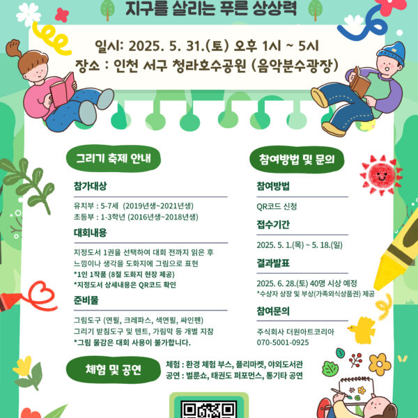 행사 참가를 원하는 인천 시민은 5월 18일까지 행사 안내 이미지의 QR코드를 통해 사전 신청할 수 있다. 심사를 통해 선정된 우수작 제출 어린이 40명에게는 상장 및 상품이 수여된다.