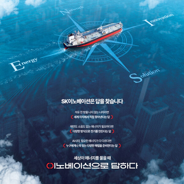 유조선을 둘러싼 나침반 형상에는 동서남북(EWSN) 대신 ‘Energy’, ‘Innovation’, ‘Solution’, ‘Network’ 등 SK이노베이션의 비전과 핵심 역량을 상징하는 단어들이 자리 잡았다. 유조선 아래 투명한 바닷속으로 빌딩이 빼곡한 대도시 전경이 펼쳐지는데, SK이노베이션이 인류에 필요한 다양한 에너지 해법을 제공한다는 의미다.