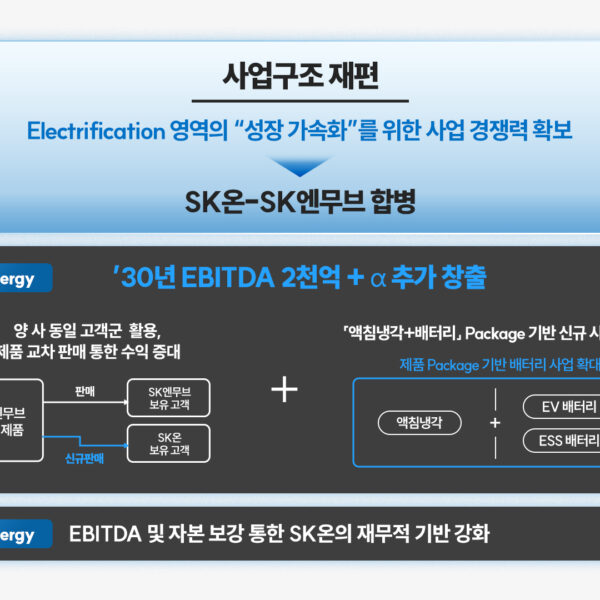 SK이노베이션이 자회사 SK온(전기차 배터리)과 SK엔무브(윤활유, 액침냉각)의 합병과 대규모 자본확충을 결의했다. 이 같은 사업 및 재무 구조 리밸런싱을 토대로 SK이노베이션은 미래 전기화(Electrification) 시대에 최고의 경쟁력을 갖춘 토털 에너지 회사로 도약해 나간다는 전략이다.