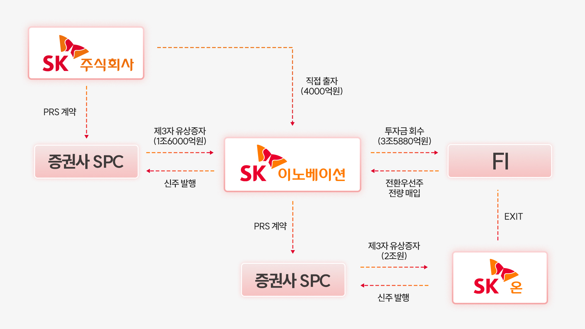 SK㈜는 SK이노베이션의 2조 원 유상증자 관련 4000억 원을 직접 출자하고, 다수의 금융기관이 참여한 1조6000억 원의 제3자 유상증자에 대해 주가수익스와프(PRS) 계약을 체결한다.