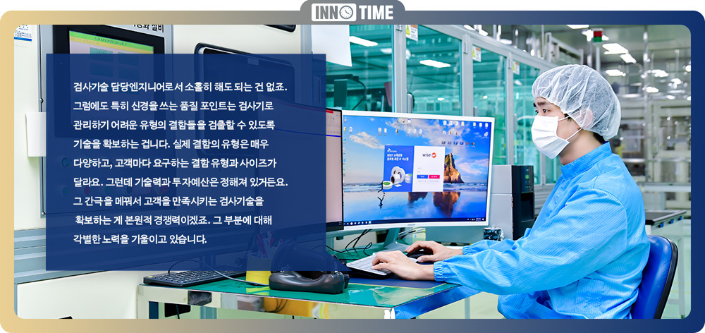 검사기술 엔지니어인 권 PM은 결함검사기 및 검사장비 최적화에 주력해 오고 있다. 검사기 앞에서 그의 움직임은 분주하다. 머리 속은 항상 고객을 향해 있고 각종 프로그램과 기계 장비 등 검사와 관련된 설비를 오간다. 검사기와 관련된 고객의 요구사항은 언제 어떻게 변화할 지 모른다. 그야말로 신속성과 효과적 대응이 철칙이다. 이를 위해 검사장비의 성능을 향상시키는 것은 물론이거니와 고객의 세부 요구에 맞춰 검사의 조건들을 보다 다양하고 고도화된 체계로 관리해내야 한다. 검사 조건은 전 세계적으로 통일된 기준으로서 적용되어야 하는 영역이다. 따라서 검사 조건의 재∙개정 등 통합적인 이력관리를 하는 것은 기본 중의 기본이다.