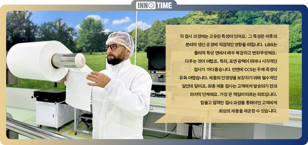 사무실에서 모니터를 들여다보면서 업무에 열중하다 현장으로 향한다. 검사기 화면을 통해 분리막을 직접 들여다보기 위해서다. 인라인(In-line) 검사의 모니터링뿐만 아니라 이와 같이 오프라인(Off-line) 테스트도 병행함으로써, 결함의 유출방지를 향한 완벽한 검사의 조건들이 만들어진다.