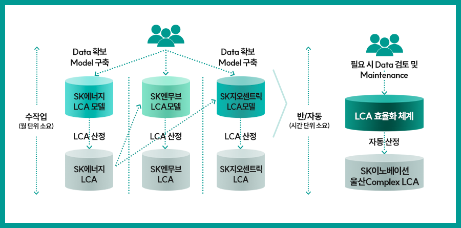 SK이노베이션이 LCA 구축에 나선 것은 2022년 1월, 환경과학기술원 산하에 담당조직을 신설하고 다음 해 8월말까지 정유 및 석유화학 사업 자회사들인 SK에너지, SK엔무브, SK지오센트릭, SK인천석유화학이 생산하는 석유-화학관련 전 제품 및 반제품 약 470여 개를 대상으로 생애주기평가를 시행해 데이터를 확보했다. 이들을 기반으로 효율화 체계 구축에 나서 작년 8월 정유업체 SK에너지와 윤활유/기유 사업을 하는 SK엔무브, 올해 3월 정유 및 석유화학 기업 SK인천석유화학에 이어 올해 8월말 석유화학 자회사 SK지오센트릭에 구축을 완료했다.