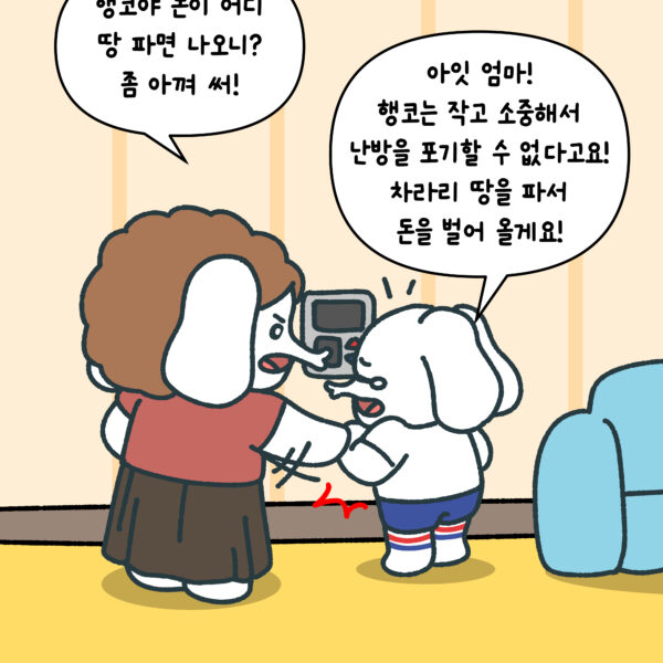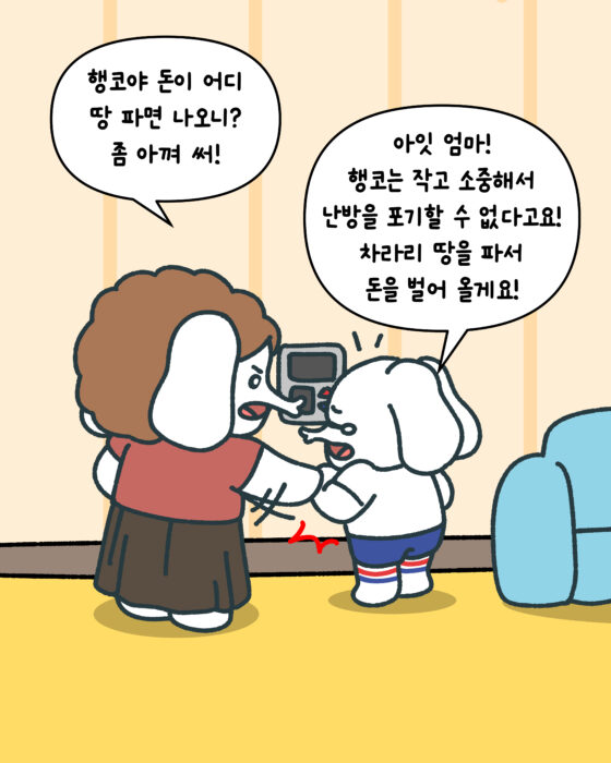 난방을 포기할 수 없었던 작고 소중한 행코는 엄마에게 떵떵 큰 소리를 쳐버렸죠. “엄마! 행코가 땅 파서 돈 벌어 올게요!”