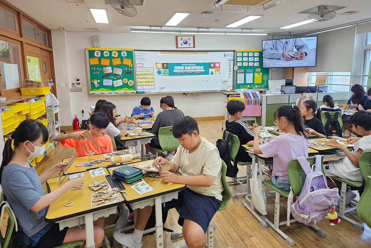 [사진 설명] 인천 서구 청라초등학교 학생들이 SK인천석유화학 친환경 놀이교실에서 키트를 조립하고 있다.