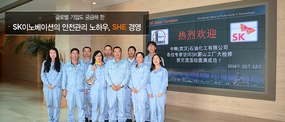 지난 2015년 8월, 173명의 인명을 앗아간 중국 텐진 폭발사고 이후, 중국은 ‘안전’에 대한 관심이 높아졌습니다. 특히 최근 중국 정유/화학 공장 사고가 빈번하게 발생하면서 SK 안전관리 기술에 대한 중국 정부의 관심도 높아지고 있는데요. 이에 따라 중국 우한시에 위치한 중한석화에 작년부터 중국 정부, 시노펙 경영진 등 고위급 인사들의 발길이 이어지고 있습니다. 바로 SK종합화학이 중한석화에 전수 중인 안전관리 시스템 ‘SHE 관리체계’에 대한 노하우를 벤치마킹하기 위함입니다.