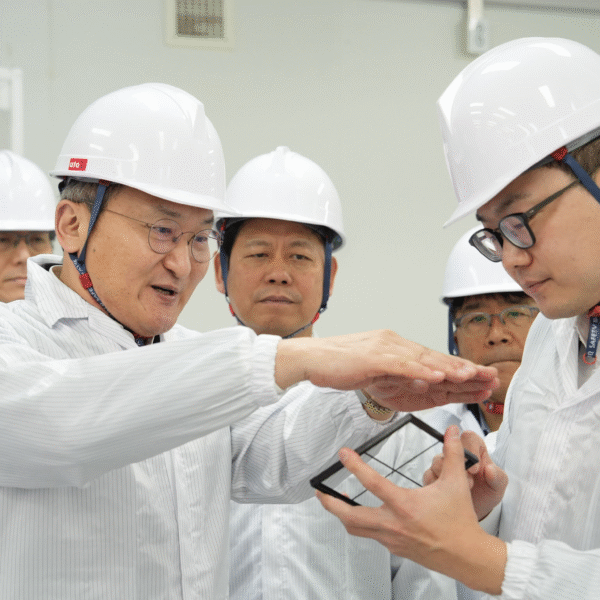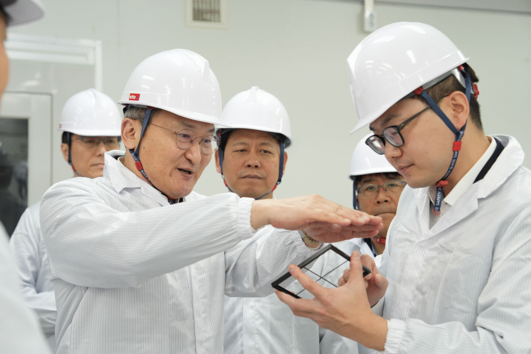 (사진2) 이석희 SK온 사장(왼쪽에서 두 번째)이 5일 대전 대덕구 스탠다드에너지 생산동에서 김부기 스탠다드에너지 대표(오른쪽)로부터 바나듐이온배터리에 대한 설명을 듣고 있다.