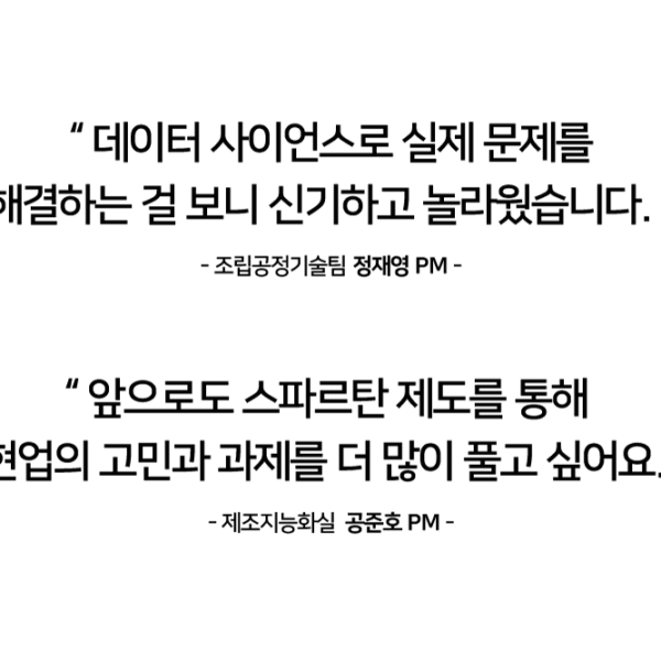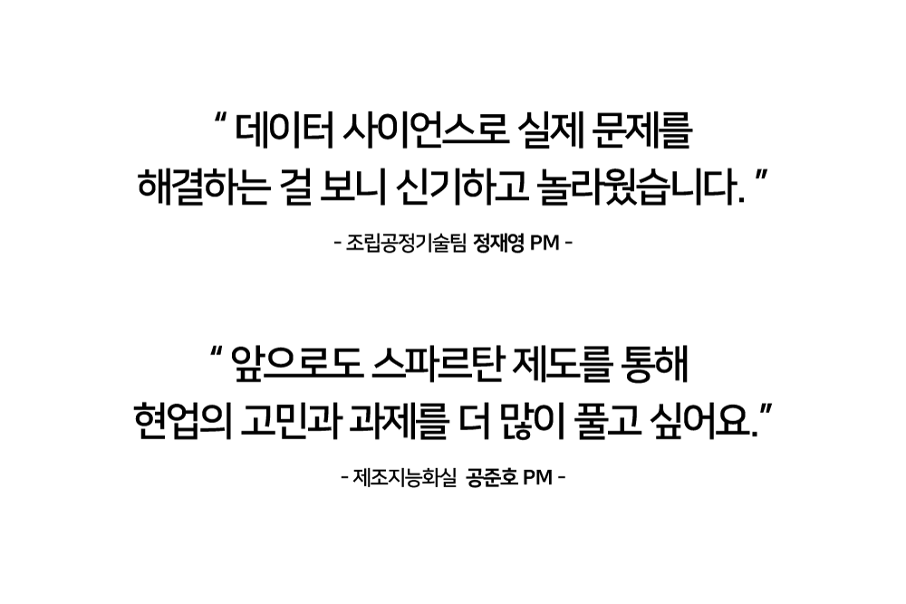 맞습니다. 그래서 저희는 학습이 실제 문제 해결로 이어지도록 현장 중심형 교육을 지향합니다. 저희가 다른 부서를 찾아가 교육을 진행하기도 하지만, 다른 구성원들을 <제조지능화실>에 초청하기도 합니다. 바로 스파르탄(Spartan) 제도가 대표적인데요. 현업 부서 실무자가 2~3개월씩 <제조지능화실>에 합류해 함께 문제를 해결하는 실전형 프로그램이죠. 여기서 역량을 쌓은 구성원은 현업에 복귀한 해당 조직의 데이터 사이언스 선생님이 되는 겁니다.