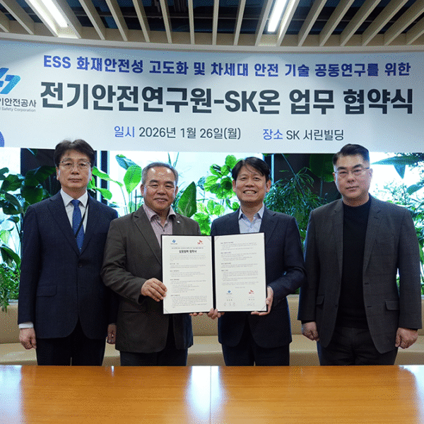 SK온이 한국전기안전공사 전기안전연구원과 함께 에너지저장장치(ESS) 안전성 강화에 앞장선다. ESS 시장 확대 속에서 화재안전성 확보 기술이 ESS 사업 경쟁력의 핵심으로 떠오르고 있다.
