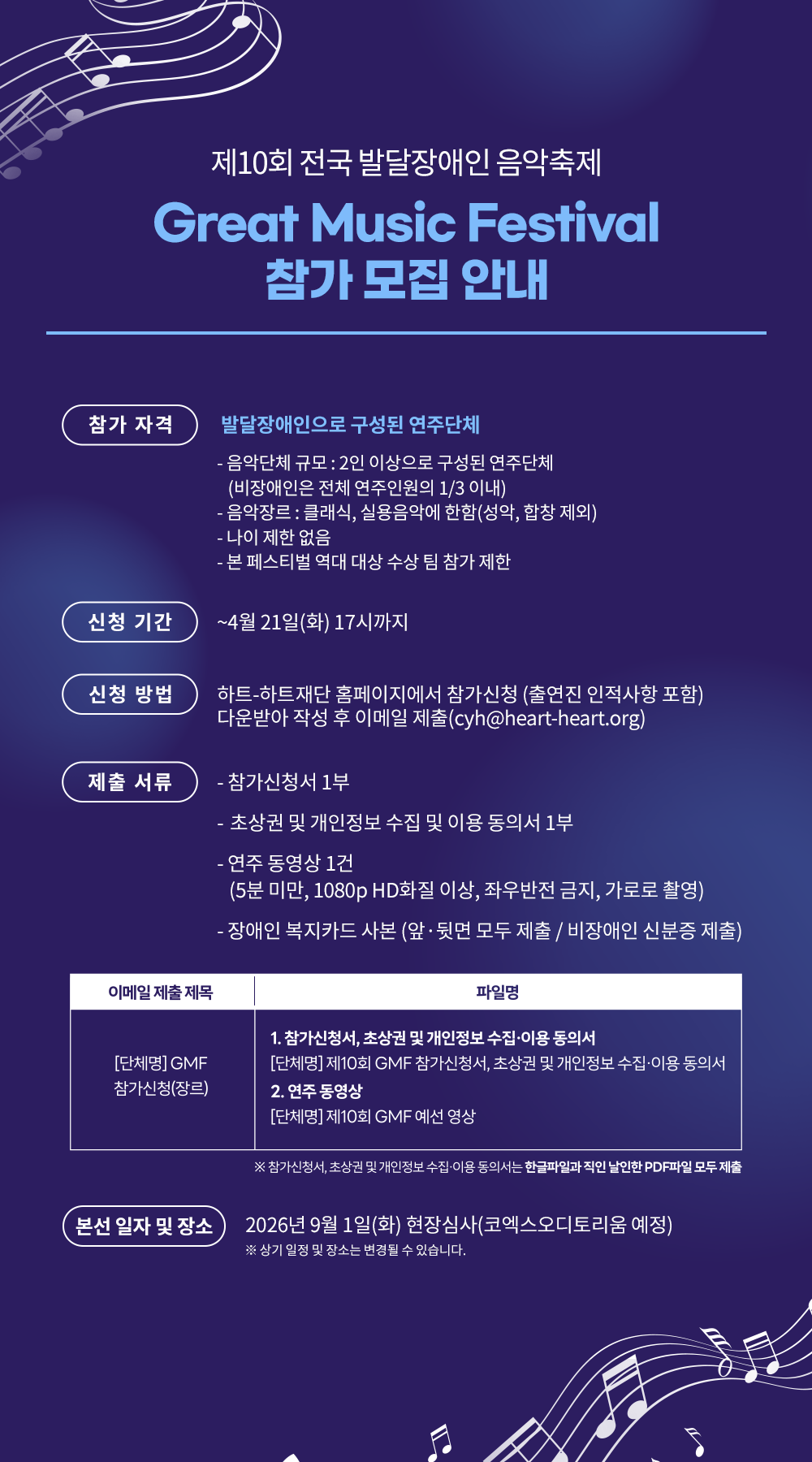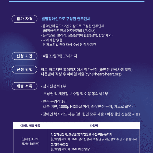 제10회 GMF는 클래식과 실용음악 분야를 연주하는 2인 이상의 발달장애인으로 구성된 연주단체를 대상으로 참가 신청을 받는다. 전문교육 이수 여부나 시설, 단체의 성격과 관계없이 발달장애인이 함께 활동하는 연주단체라면 누구나 GMF에 참가할 수 있다. 단, 역대 대상 수상팀은 참가가 제한된다.