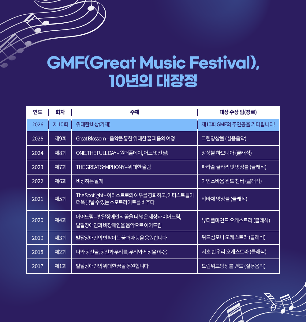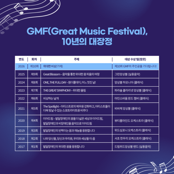 지난 10년간 GMF는 발달장애인 연주자들이 음악을 통해 사회와 소통하고, 전문 예술인으로 성장할 수 있는 기반을 마련해왔다. 제10회 GMF는 이러한 성과를 바탕으로 새로운 도약의 기회를 제공할 것이다.