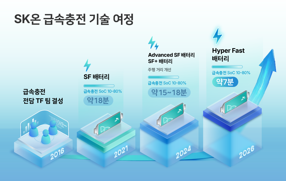 이러한 기술적 과제를 해결하기 위해 SK온은 2016년부터 전담 TF를 운영하며 급속충전 기술을 단계적으로 축적해 왔다. 2021년 선보인 ‘SF(Super Fast) 배터리’는 듀얼 레이어 코팅을 적용해 18분 급속충전을 구현했다. 해당 기술은 세계 최대 전자·IT 전시회인 CES 2023에서 국내 업계 최초로 ‘최고혁신상’을 수상했다. 이어 2024년에는 급속충전 시간을 15분으로 단축한 ‘SF+ 배터리’를 선보였다. 듀얼 레이어 구조에 고용량 실리콘과 저저항 흑연을 배치해 리튬이온의 이동 거리를 줄이고, 이동 속도는 높였다. 또한 같은 해, 자기 배향 공법*을 도입해 기존 SF 배터리 대비 에너지 밀도를 8% 향상시키면서도 급속충전 성능은 유지한 ‘Advanced SF 배터리’도 공개했다. 이러한 기술 진화를 바탕으로 SK온은 올해 3월 인터배터리 2026에서 배터리 충전 상태 10~80% 구간을 7분 이내에 충전하는 ‘Hyper Fast 배터리’ 기술을 제시했다.