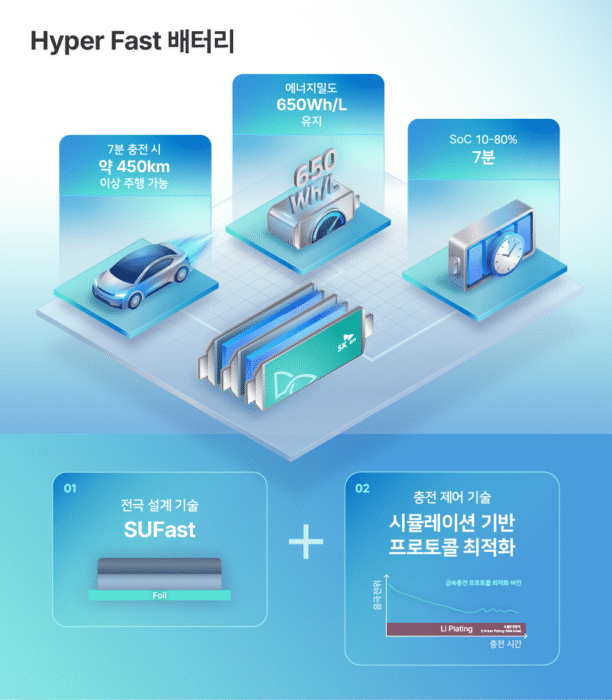Hyper Fast 배터리는 7분 충전으로 약 450km 이상 주행이 가능하다. 이는 서울에서 부산까지 이동 가능한 수준이다. 내연기관차의 주유 시간과 유사한 3분 충전만으로도 약 200km를 추가 주행할 수 있다. 일반적으로 에너지 밀도가 높을수록 주행거리가 늘어나지만, 앞서 설명한 것처럼 고에너지 밀도화는 급속충전 환경에서 음극 저항 증가와 수명 저하를 동반할 수 있다. 그럼에도 SK온이 에너지 밀도 650Wh/L를 유지하면서 충전 속도를 높인 배경에는 SUFast(SUper-Fast)시뮬레이션 기반 프로토콜 최적화라는 두 기술의 결합이 있다.