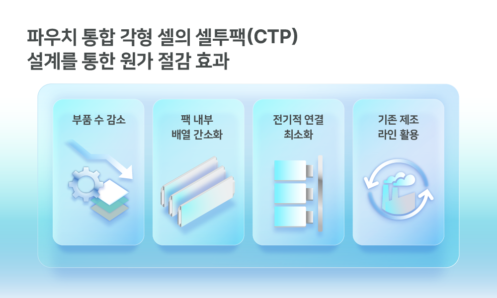 파우치 통합 각형 셀의 핵심은 셀투팩 설계에 유리하다는 점이다. 각형 알루미늄 케이스가 구조적 강성을 갖췄기 때문이다. 그 결과 팩 내부 부품 수가 줄고, 팩 내부 배열도 단순해져 원가 경쟁력을 높였다. 또 내부 탭을 일방향으로 정렬해 외부 버스바 연결을 단순화할 수 있어 팩 단위의 전기적 연결 부품 수를 최소화한다. 생산 측면에서도 장점이 있다. 기존 파우치형 배터리 셀 제조 라인을 활용할 수 있어 추가 설비 투자를 최소화하면서도 각형 수준의 조립 효율성을 확보했다. 이와 같은 제품 원가 절감과 신규 설비 투자 최소화를 통해, 장기적으로는 전체 운영 비용(Total Cost of Ownership, TCO)을 개선할 수 있다.