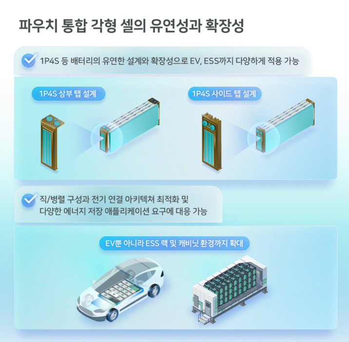 파우치 통합 각형 셀의 또 다른 특징은 설계 유연성이다. 알루미늄 케이스 내부에서 셀의 전기적 연결 방식과 외부 팩에 연결하는 탭 방향을 비교적 자유롭게 구성할 수 있다. 예를 들어 1P4S(병렬 1개, 직렬 4개), 2P2S(병렬 2개, 직렬 2개) 등 전압이나 용량에 맞춰 셀 연결 구성을 조정할 수 있다. 같은 1P4S 구조에서도 셀의 양극과 음극 단자를 케이스 상부에 배치하는 ‘톱 탭(Top-tab)’과 측면에 배치하는 ‘사이드 탭(Side-tab)’을 모두 구현할 수 있다. 이러한 설계 유연성은 고객 요구에 맞는 배터리 구성을 가능하게 한다. 전기차뿐 아니라 ESS 랙과 ESS 캐비닛 등 다양한 형태에도 대응할 수 있다. 또 알루미늄 케이스 내부에 파우치 셀을 적층하는 구조로, 셀 크기 조정이 용이하다. 이를 통해 일반 각형 셀 대비 팩 내부 공간 활용도를 높일 수 있으며, 약 6.1% 수준의 개선 효과를 보인다.