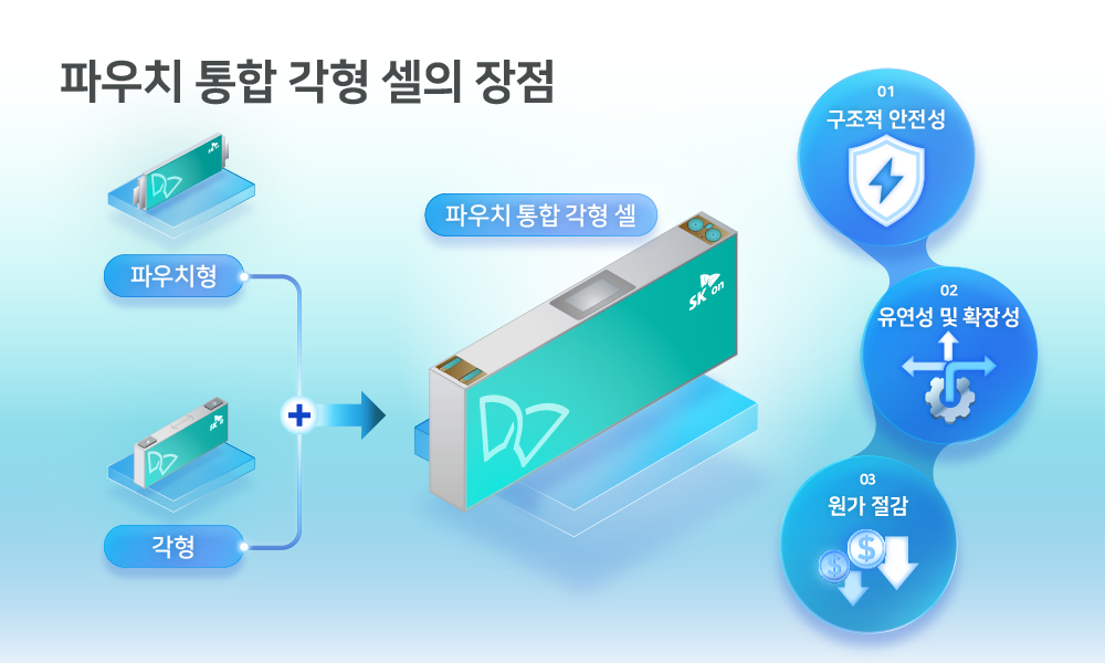‘파우치 통합 각형 셀’은 파우치형의 설계 유연성과 각형의 구조적 장점을 결합한 셀이다. 단순한 형태의 절충을 넘어 셀에서 구현 가능한 최상의 성능을 확보하면서, 팩에서의 기계적 성능과 안전성을 동시에 개선한 것이 특징이다. 현재 SK온의 ‘파우치 통합 각형 셀’은 최종 성능 검증을 위한 시제품 단계에 있으며, 상용화를 위한 개발을 이어갈 예정이다.