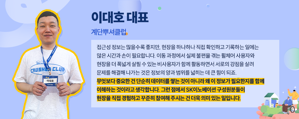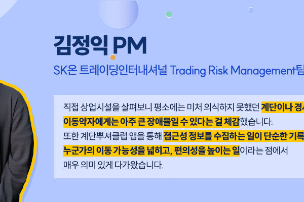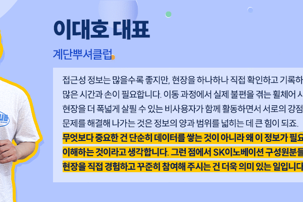 활동을 시작한 2025년부터 현재(2026년 4월 28일 기준)까지 SK이노베이션 계열 구성원 총 250여 명이 참여했으며, 수집한 접근성 정보는 6600여 건에 달한다. 한 명 한 명의 발걸음이 쌓여, 이동약자가 실제로 참고할 수 있는 생활밀착형 정보가 조금씩 넓어지고 있는 것이다.