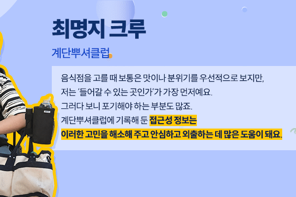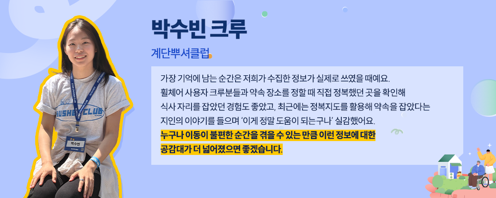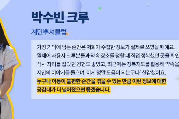 크러셔데이가 열린 4월은 장애인의 날(4/20)이 있는 달이다. 이동약자의 삶을 돌아보자는 사회적 메시지가 다시 한번 환기되는 시기이기도 하다. 다만 일상 속 불편을 실질적으로 개선하기 위해서는, 문제를 인식하는 데서 그치지 않고 이동약자에게 어려움으로 다가오는 요소들을 직접 확인하고 필요한 정보를 수집해 실제 변화로 이어가야 한다. 그 간극을 조금씩 좁혀 온 단체가 바로 ‘계단뿌셔클럽’이다.