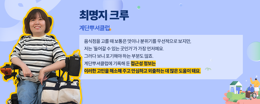 계단뿌셔클럽은 이동약자가 다니기 쉬운 세상을 만들기 위해 현장의 접근성 정보를 수집하고, 누구나 볼 수 있는 지도를 앱으로 만들어 왔다. 경사로가 있는지, 문턱 높이는 어느 정도인지, 화장실은 이용 가능한지처럼 누군가에게는 사소해 보이는 정보가 이동약자에게는 외출 가능 여부를 결정짓는 기준이 되기도 한다. 이러한 어려움을 해결하기 위한 움직임의 출발점으로 ‘정복활동’이라 불리는 현장 정보 수집 활동을 통해 그 정보를 차곡차곡 쌓아가고 있는 것이다.