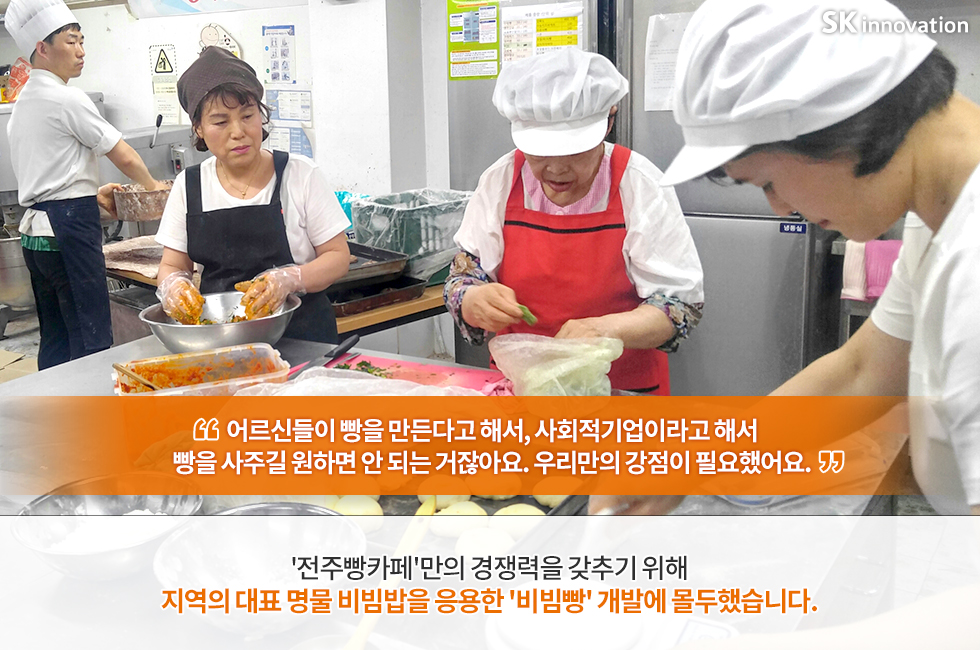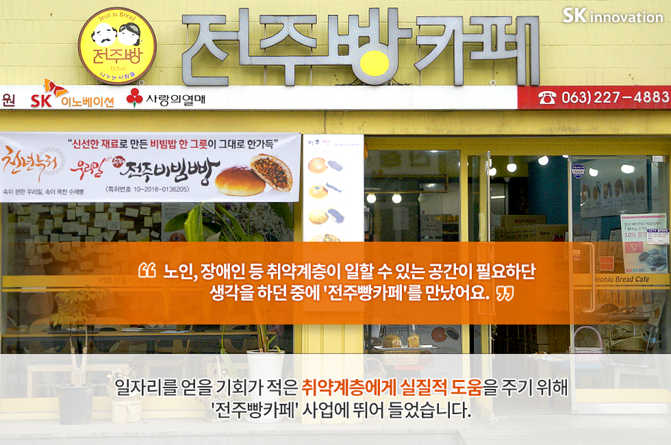 최근 SNS 상에서 전주의 ‘핫’한 명소로 떠오르고 있는 ‘전주빵카페’. 건강한 재료를 사용한 먹음직스런 빵들이 가득한 이 곳은 노인 및 장애인 등 취약계층 일자리 창출을 위해 SK이노베이션이 설립을 지원한 사회적기업이랍니다.