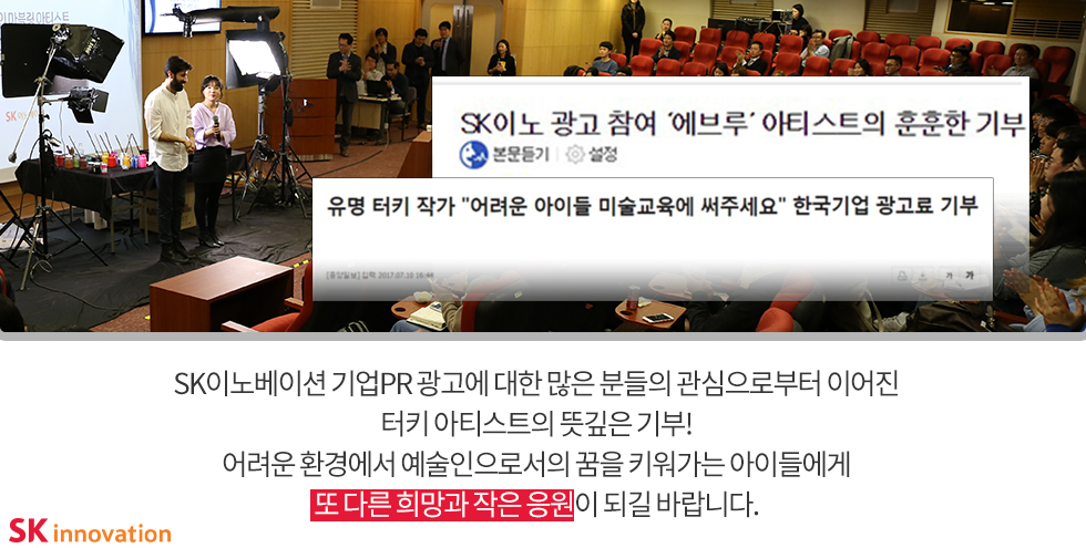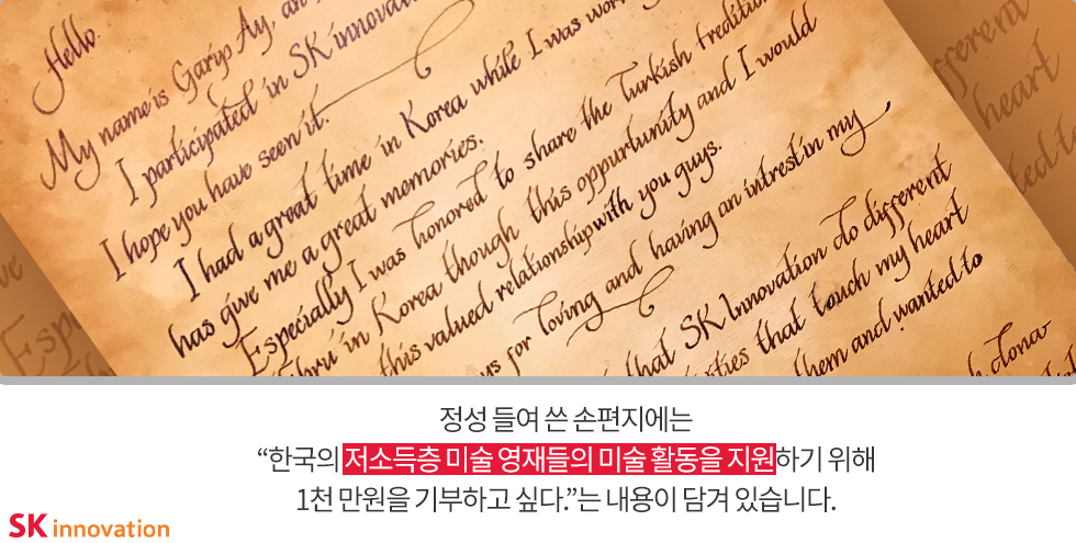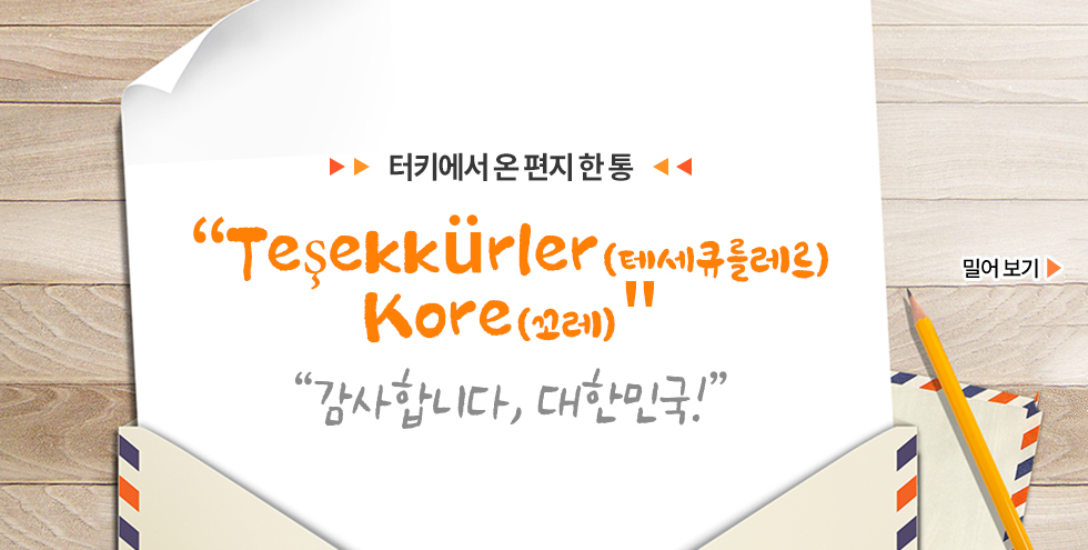 터키에서 온 편지 한 통 “Teşekkürler(테세큐를레르) Kore(꼬레)” “감사합니다, 대한민국!” 2017. 07. 10 SK이노베이션 터키에서 온 편지 한 통 “Teşekkürler(테세큐를레르) Kore(꼬레)” “감사합니다, 대한민국!” AI 요약 AI 보이스 미디어 키트 이전글 다음글 연관 콘텐츠 PRESS SK이노베이션 울산Complex, 울산 지역 내 독거노인 결식 문제 해결사로 변신! – ‘SK 한끼 나눔 온(溫)택트 지원사업’ 추진 2022.04.26 PRESS “따뜻한 한끼 나눔, 코로나19를 이기는 희망 백신” – SK에너지, 민족 최대 명절 앞두고 ‘한끼 나눔 온(溫)택트’ 봉사활동으로 행복 나눠 2021.02.05 PRESS SK이노베이션, 코로나 결식 해소 ‘한끼 나눔 온(溫)택트’ 6만식 나눔 릴레이 2021.02.03 PRESS 코로나·결식 이중고 녹인다… SK이노베이션 울산Complex, ‘SK 한 끼 나눔 온(溫)택트 지원사업’ 추진 2021.01.26