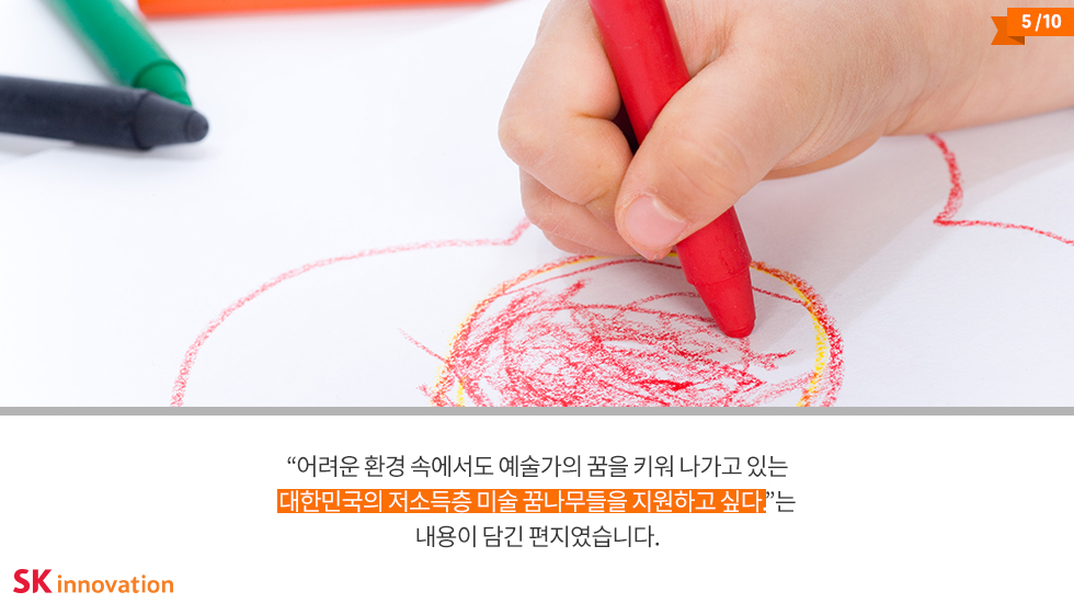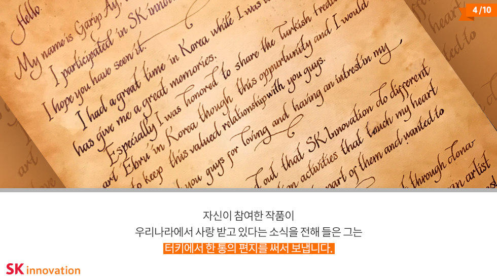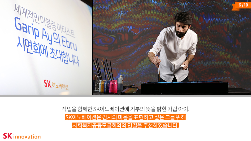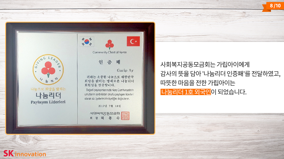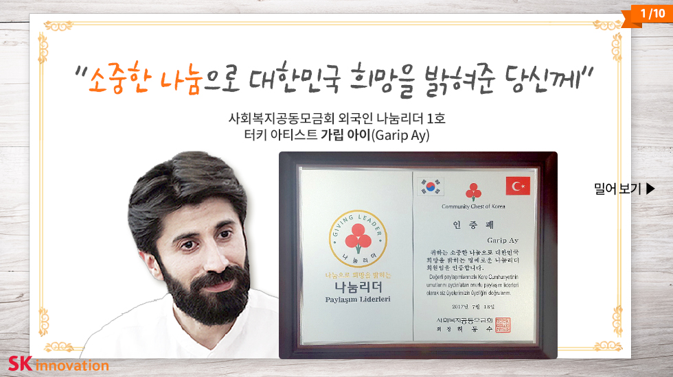 “소중한 나눔으로 대한민국 희망을 밝혀준 당신께” – 사회복지공동모금회 외국인 나눔리더 1호 터키 아티스트 가립 아이 2017. 07. 26 SK이노베이션 “소중한 나눔으로 대한민국 희망을 밝혀준 당신께” – 사회복지공동모금회 외국인 나눔리더 1호 터키 아티스트 가립 아이 AI 요약 AI 보이스 ■ 관련 글 – 터키에서 온 편지 한 통 “Teşekkürler(테세큐를레르) Kore(꼬레)” “감사합니다, 대한민국!” 미디어 키트 이전글 다음글 연관 콘텐츠 PRESS SK이노베이션, 대한민국 산업계 심장 역할로 경제발전 이끌어 2024.11.25 PRESS ‘대한민국 동행세일’에 고래인형으로 해양환경 보호하는 사회적기업 ‘우시산’이 떴다! 2020.07.10 PRESS 헝가리 코마롬市가 SK이노베이션에 보내온 편지 2020.06.15 사회적가치 뉴스 PEOPLE & CULTURE SK이노베이션의 착한 혁신, 기업PR캠페인 소비를 기부로 연결 2017.11.16