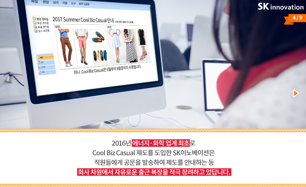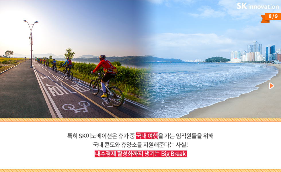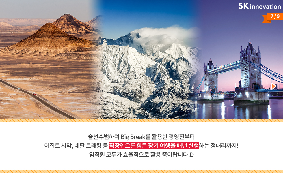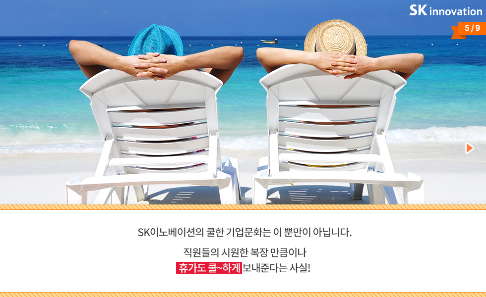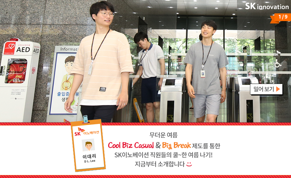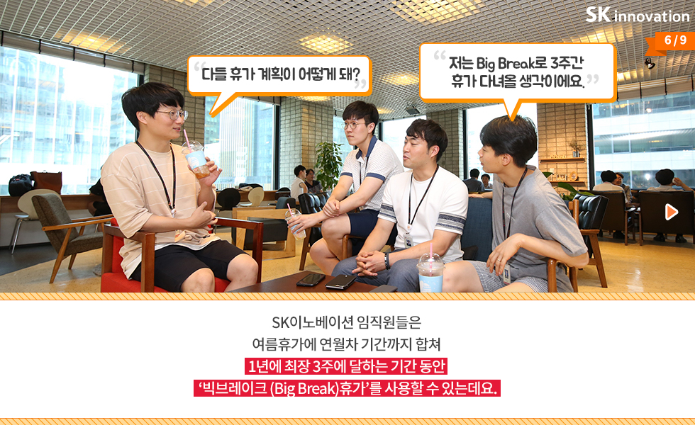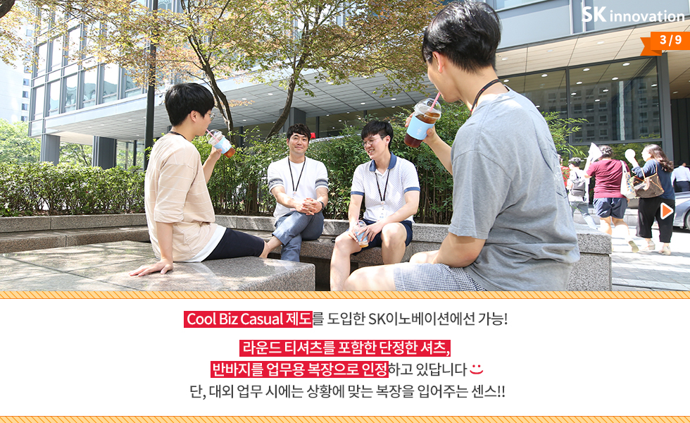 SK 이노베이션은 복장에서 오는 스트레스를 줄이면서 업무 집중도까지 높일 수 있도록 가벼운 옷차림을 장려하는 Cool Biz 제도를 시행하고 있습니다. 게다가 최장 3주까지 자유롭게 휴가를 이용할 수 있는 Big Break까지!