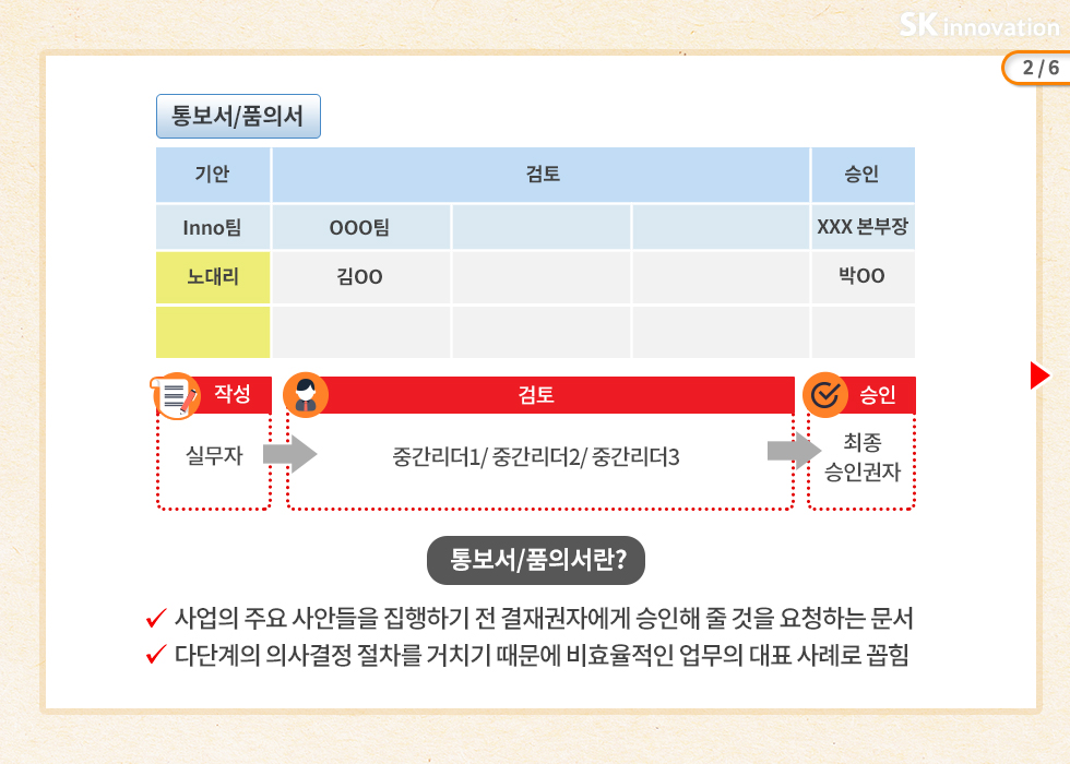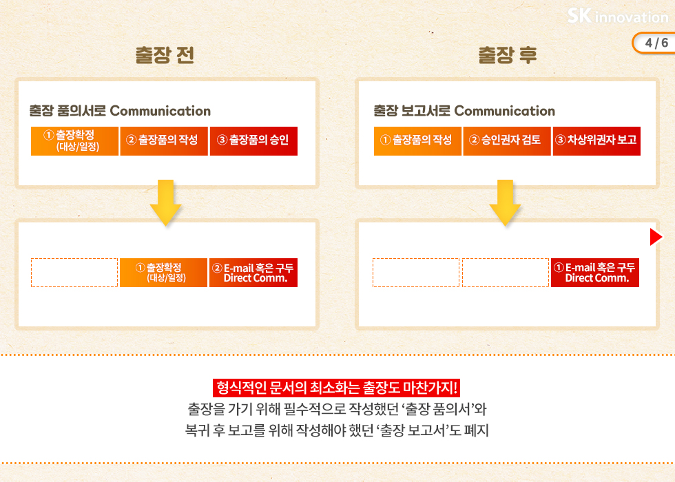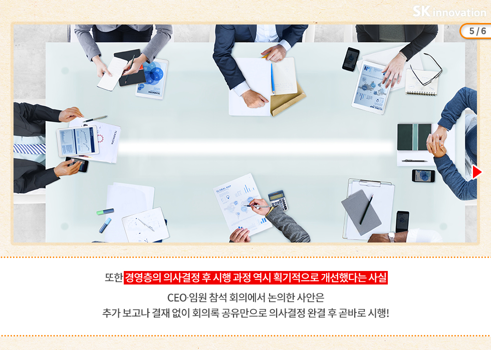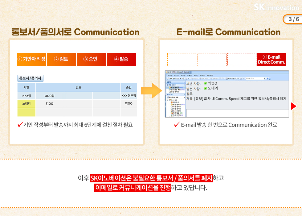 보고 후 승인을 받은 사항에 대해서 형식적으로 작성해야 했던 <품의서/통보서> 대신 이메일로 절차를 간소화하였습니다. 뿐만 아니라 회의에 참석한 경영층의 의사결정 사항의 경우 추가 보고나 결재 없이 회의록을 공유하는 것으로 완결! 불필요한 승인 절차와 형식을 혁신적으로 개선한 SK이노베이션.