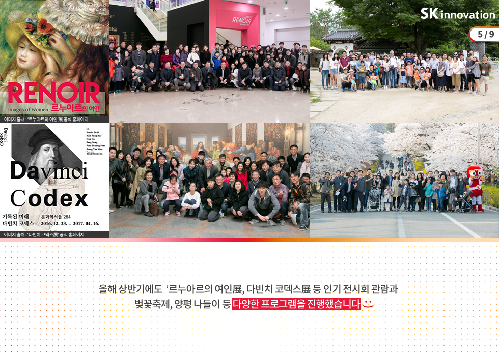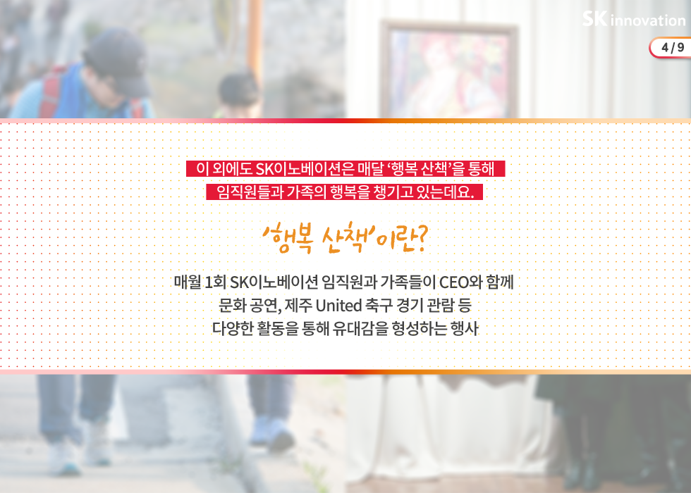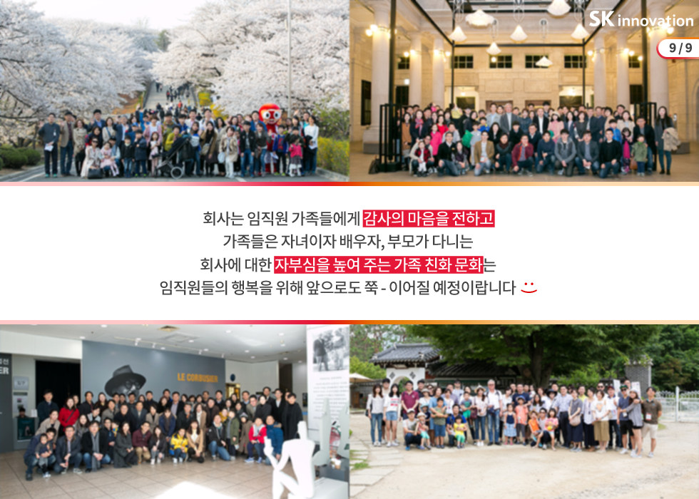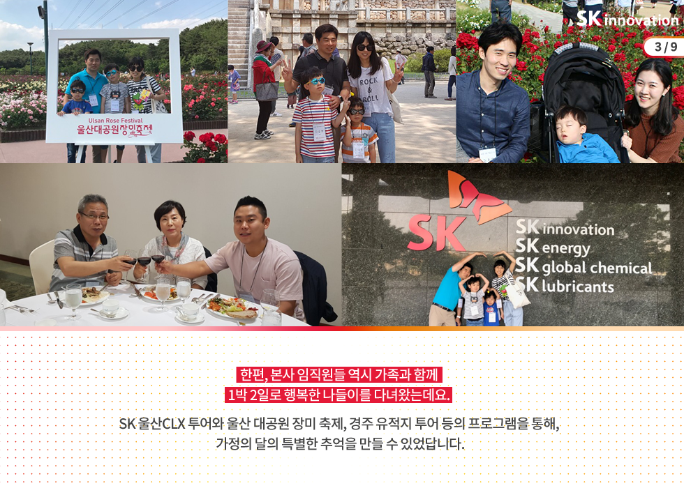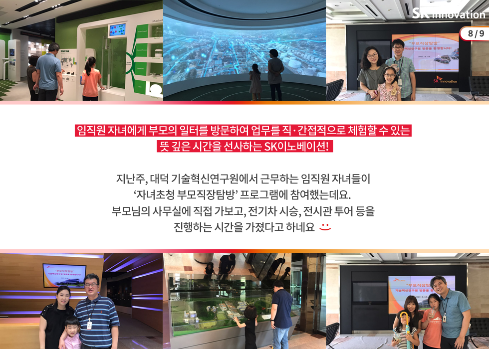 SK이노베이션은 다양한 제도 및 프로그램을 통해 가족 친화적 기업 문화를 꾸준히 조성해 나가고 있는데요. 매월 1회 임직원들과 그 가족들이 CEO와 함께 다채로운 문화 활동을 즐기며 유대감을 형성하는 ‘행복 산책’을 비롯해 지난 5월 가정의 달을 맞아 진행한 ‘패밀리 위켄드’, 임직원 가족들을 위한 각종 교육 프로그램까지!
