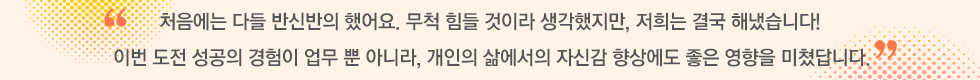 실제로 구급관련 응급구조사 자격 취득에 도전한 한 팀원은 자신보다 훨씬 열악한 환경에서 자격증 취득을 위해 노력하는 다른 사람들을 보며, 더욱 자극을 받게 되었다고 전했는데요. 그 덕분에 응급구조사 자격 취득에 성공했을 뿐 아니라 지금도 틈틈이 개인 역량 향상을 위해 업무관련 다른 자격증 취득을 준비하고 있다는 점!