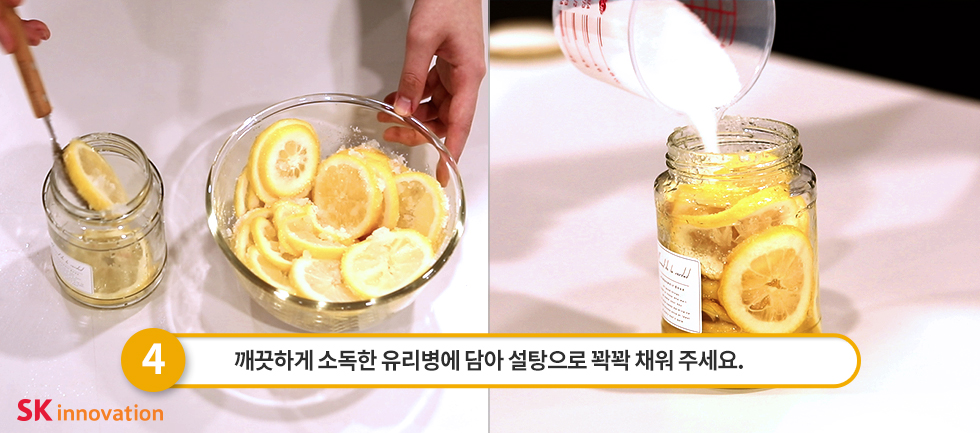 얇게 슬라이스한 레몬을 설탕과 1:1의 비율로 버무려 주세요. 설탕이 적당히 녹았을 때 즈음, 유리병에 담은 후 방부제 역할을 하는 설탕을 가득 덮어주시면 레몬청이 완성되는데요.