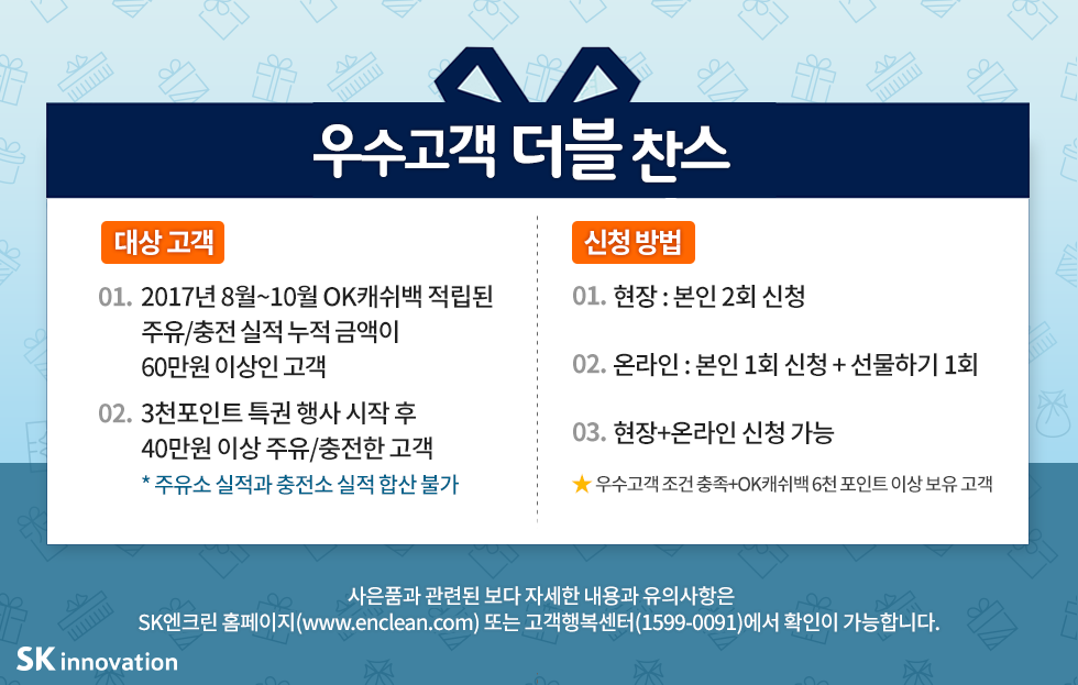 이번 행사는 2017년 10월 1일 이후, SK주유소에서 3만원 이상(충전소 2만원 이상) 주유한 고객 중 OK캐쉬백 3천포인트 이상을 보유하신 고객이라면 누구나 참여하실 수 있는데요!