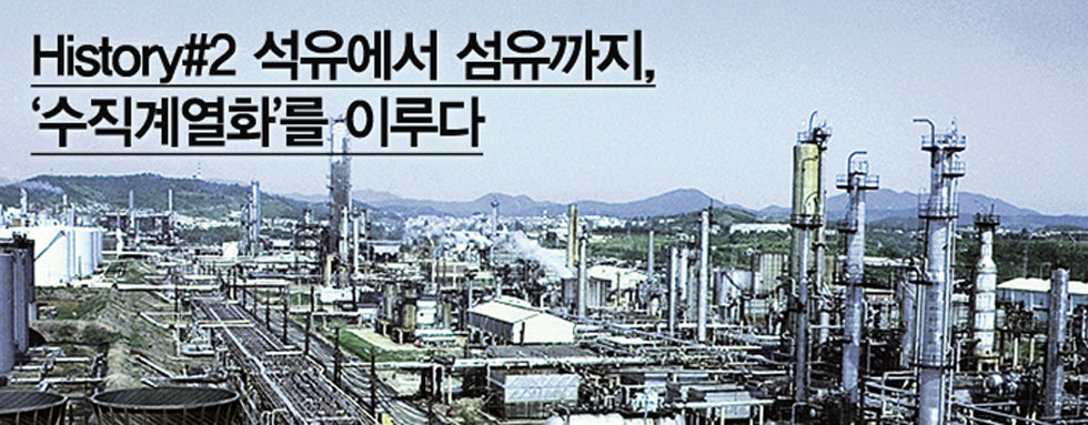 ‘수직계열화’란 원료로부터 최종 제품 생산에 이르기까지의 모든 공정을 독자적으로 수행할 수 있는 체제를 이릅니다. History#1 선경 직물의 탄생과 성장(링크)에서 선경이 독자적인 ‘폴리에스터’ 원사 생산 능력을 갖추었던 것을 기억하실 텐데요. 원사 생산자에 휘둘리지 않고 안정적으로 제품을 생산할 수 있는 계기가 되었습니다. 수직계열화는 사실 이때부터 시작된 것과 다름없습니다. 폴리에스터 원사의 원료인 DMT 가격이 제1차 석유파동으로 폭등했을 때에는 DMT공장 건설을 추진하기도 했죠.