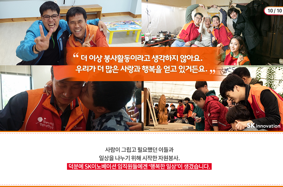 기업의 자원봉사 활동은 임직원들의 자발적 참여와 진정성이 없으면 지속되기 힘든 법! SK이노베이션 모든 임직원들은 앞으로도 행복을 사회적 가치로 선순환 시키는 다양한 방법들을 고민하고 실천해 나갈 예정입니다. 🙂