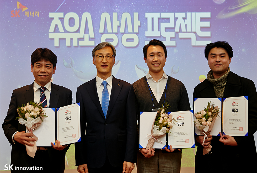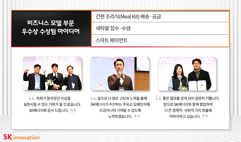 비즈니스 모델 부문의 경우, 비즈니스 모델 경쟁력, 실현 가능성과 사회적 가치 창출 효과 등을 고려해 아이디어로 제안한 우수상 3팀과 장려상 5팀이 선정되었는데요. SK에너지는 향후 수상팀들과 사업화 여부를 검토하고 이르면 올해 중 사업화를 진행할 예정입니다.