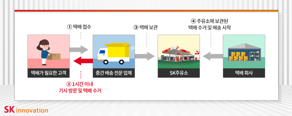 이번 협약이 구체화 되면 택배가 필요한 기업이나 일반 고객은 지금까지와 달리 택배 발송, 수령에 오랜 시간을 소비하지 않아도 되는데요. 중간 배송 전문업체에 택배 접수를 하면 1시간 이내에 기사가 방문하여 택배를 수거해 주유소에 보관하게 되고, 택배회사는 정해진 시간에 주유소를 방문해 택배를 수거하고 배송을 시작하게 됩니다.