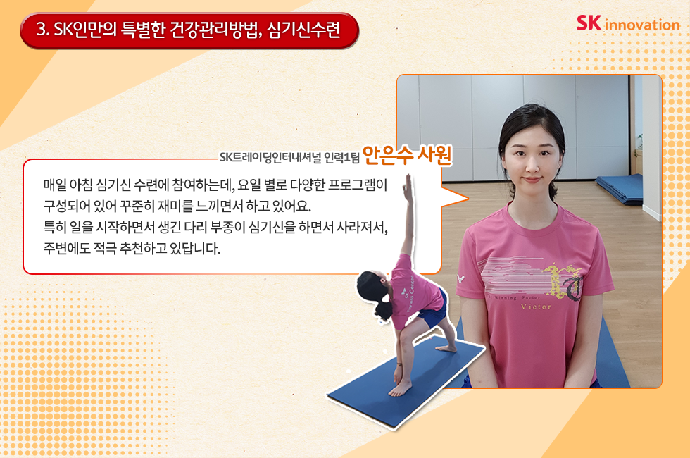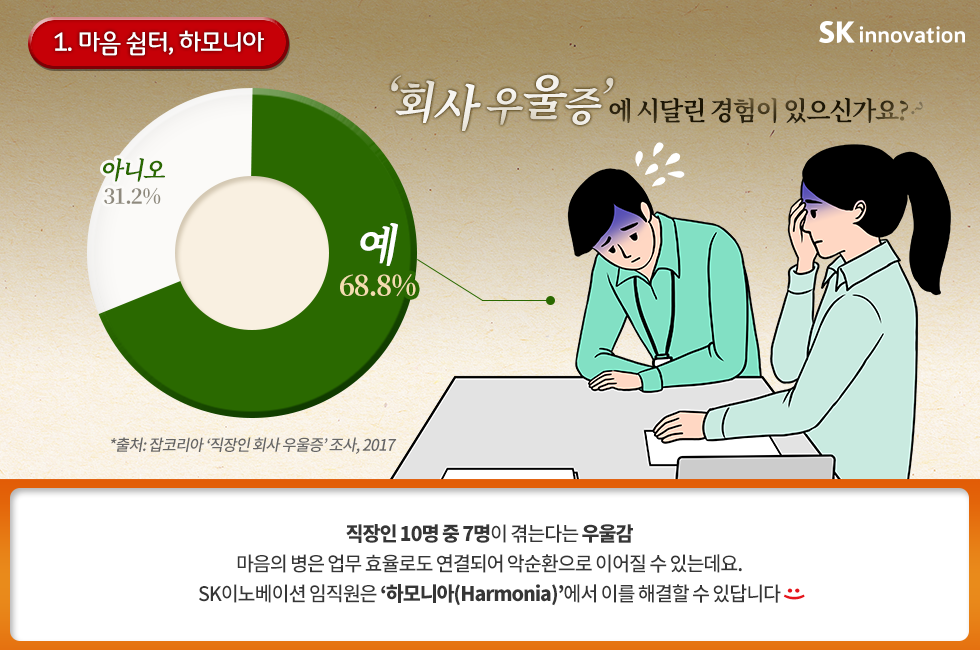 탄력근무제, 빅브레이크, SK행복어린이집 운영 등을 통해 임직원의 Work&Life Balance를 지원하는 SK이노베이션은 업무 중인 임직원들의 몸과 마음도 챙기고 있는데요.