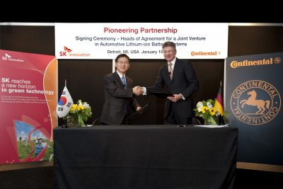 SK이노베이션(대표 구자영, www.SKinnovation.com)은 10일 구자영 SK이노베이션 사장, 엘마 데겐하르트 콘티넨탈社 회장 등 관계자 20여 명이 참석한 가운데,디트로이트 모터쇼 현장에서 배터리 JV(합작법인) 설립을 위한 HOA(Head of Agreement)를 체결했다고 밝혔다.
