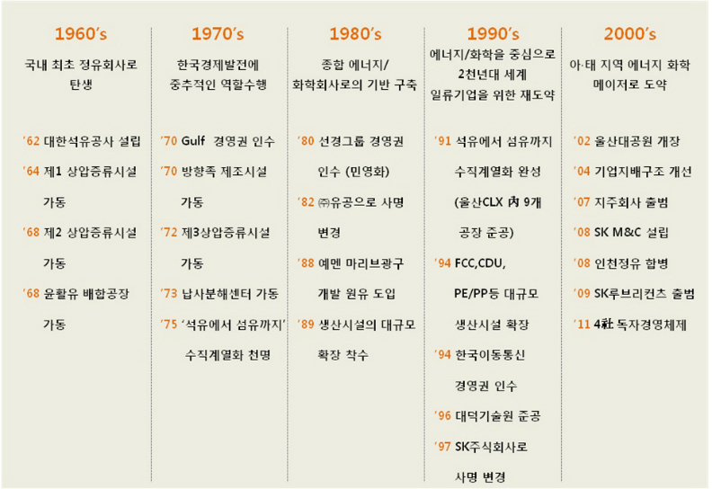 지난 반세기 동안 대한민국과 전세계에 에너지를 공급한 SK이노베이션은 이제 새로운 성장을 준비하고 있습니다. 지난 2011년 1월 1일 SK이노베이션으로의 사명 변경과 함께 2009년 분사한 SK루브리컨츠에 이어 석유사업과 화학사업을 각각 SK에너지와 SK종합화학으로 분사했으며, 2013년 7월1일부로 SK인천석유화학과 SK트레이딩인터네셔널을 출범, 6사 독자경영체제의 구축하고 기존 사업의 경쟁력 강화와 신성장동력 발굴 노력을 가속화 하고 있습니다.
