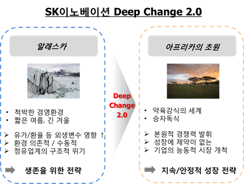 SK이노베이션 김준 사장은 30일 기자간담회를 열고 “딥 체인지 1.0으로 짧은 여름과 긴 겨울의 알래스카에서도 생존할 수 있는 체력을 갖춘 만큼이제는 지속적인 성장을 위해 경영전쟁터(Battle Field)를 아프리카의 초원으로 옮기는 딥 체인지 2.0을 시작한다고 선언했다.
