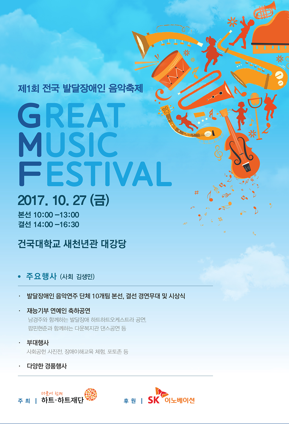 이노베이션(대표이사 김준www.SKInnovation.com)은 오는 27일 금요일 오후 2시 서울 광진구에 위치한 건국대학교 새천년관 대강당에서 하트하트재단과 함께 제 1회 발달장애인음악축제_Great Music Festival를 개최한다고 밝혔다.