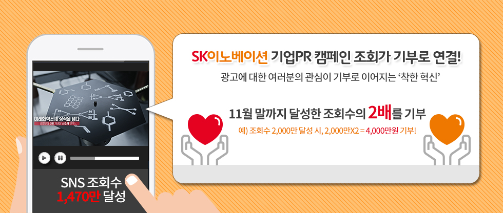 SK이노베이션(대표이사 : 김준, www.SKinnovation.com)이 기업광고와 사회공헌을 잇는 새로운 도전을 시작한다. SK그룹 전사적으로 진행되는 ‘행복 나눔의 계절’ 사회공헌 및 자원봉사와 연계하여 기업PR 캠페인 조회수에 따라 사회공헌 기부액을 결정하는 새로운 방식의 사회공헌 활동이다.