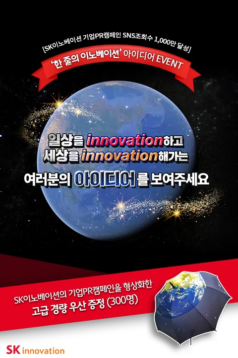 SK이노베이션이, 지난 3월 런칭한 기업PR 캠페인 ‘세계가 이노베이션 한다’ 를 주제로 현실 세계에서도 이노베이션이 확산될 수 있는 ‘일상 속 이노베이션 한 줄 아이디어’ 공모전을5월 1일부터 일주일간 진행한다고 밝혔다.