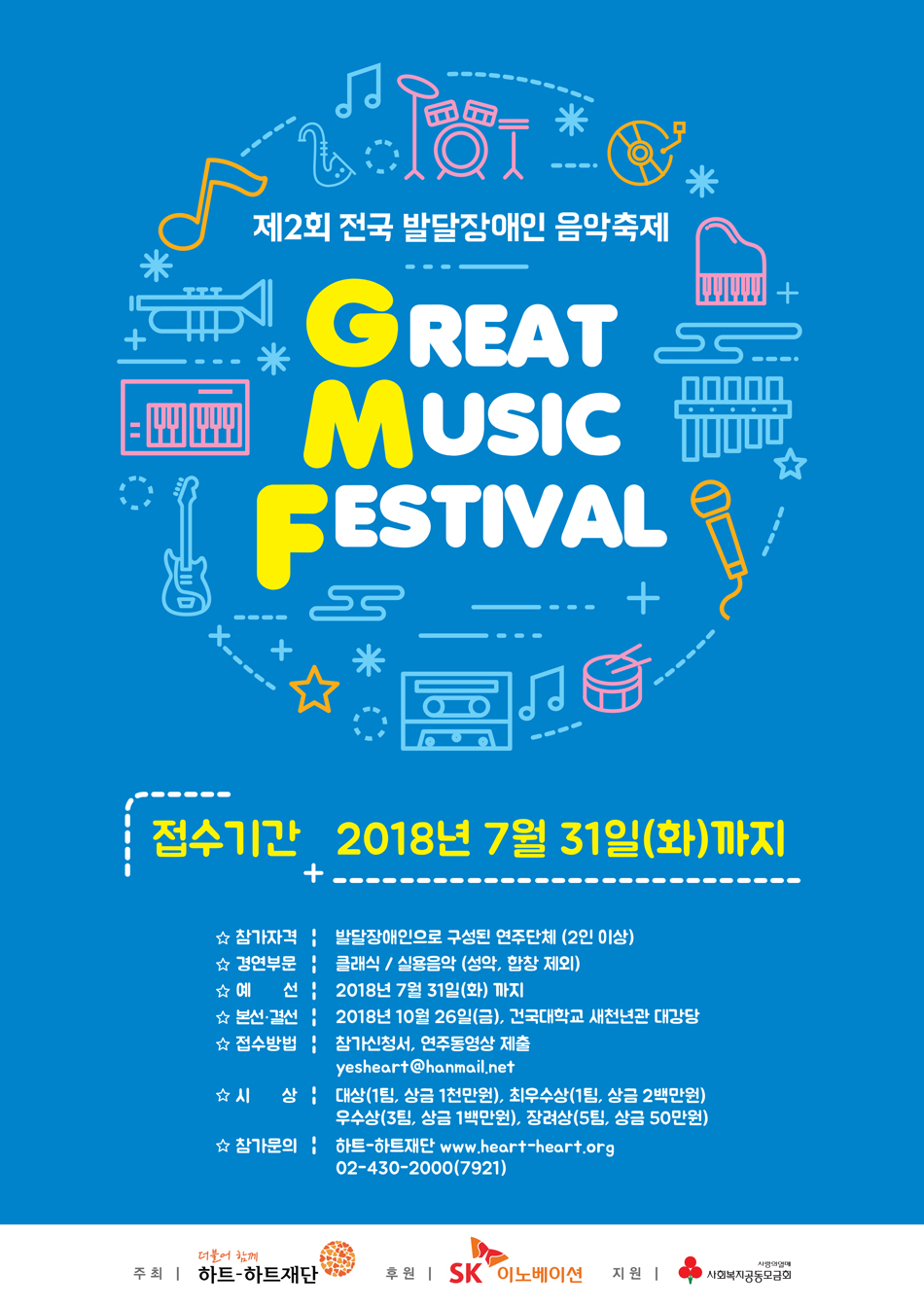 * “발달장애인들이 음악적 재능을 마음껏 펼칠 수 있는 장(場) 마련할 것”SK이노베이션과 하트–하트재단이 제2회 전국 발달장애인 음악축제 ‘그레이트 뮤직 페스티벌(Great Music Festival)’의 참가자를 모집한다. SK이노베이션이 후원하고, 하트–하트재단이 주최하는 이 행사는 클래식과 실용음악 부문 발달장애인 경연축제다.2인 이상 발달장애인으로 구성된 연주 팀이라면 누구나 ‘그레이트 뮤직 페스티벌’에 참가 신청이 가능하다. 참가 희망 팀은 7월 31일까지 하트–하트재단에 참가 신청서와 5~7분 이내의 연주 동영상을 제출해야 한다. 본선 진출 팀은 8월 중순 경 발표된다.본선과 결선 대회는 각각 오는 10월 26일 오전과 오후에 서울 광진구 자양동에 위치한 건국대학교 새천년관 대강당에서 치러질 예정이다. 우승 팀에게는 최대 1천만원의 상금과 연간 다양한 연주 기회가 제공된다.SK이노베이션과 하트–하트재단은 지난 해 10월 제1회 전국 발달장애인 음악축제를 개최했다. 작년에는 전국 38개팀(총 343명)이 예선에 참가했고, 그 중 다섯 개 팀이 결선에 진출했다. 이 날 우승한 팀은 발달장애 청소년들로 구성된 클라리넷 앙상블 ‘드림위드앙상블’이었다.