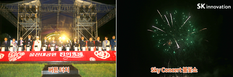 그 뜨거운 열기를 이어 화려한 점등식이 진행되었는데요. 축제의 시작을 알리는 버튼 터치로 포문을 연 점등식! 불꽃, 영상, 특수조명을 활용한 울산 최대 Sky Concert 불꽃쇼부터 성악가 김동규씨와 국악인 오정해씨가 들려주는 클래식 공연까지 이어져 관람객들의 시선을 사로잡았습니다.