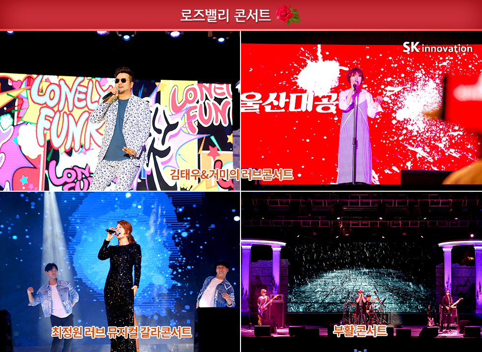 장미원에 피어난 세계 각국의 다양한 장미를 주제로 펼쳐진 로즈밸리 콘서트는 밤시간대에 진행되었는데요. 인기가수 김태우와 거미, 뮤지컬 배우 최정원, 부활 등 최정상급 가수들이 출연해 축제에 뜨거운 열기를 더했습니다.